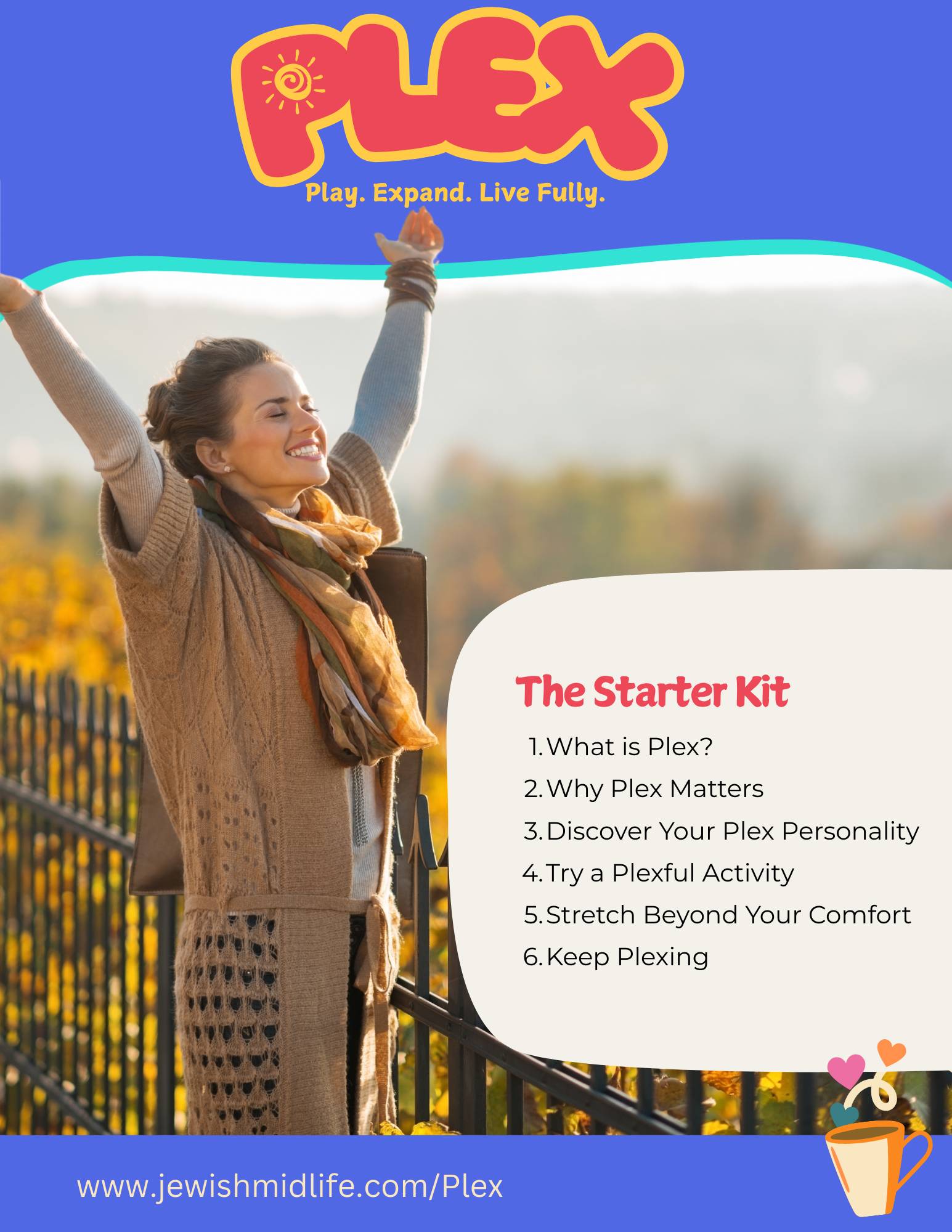 This Starter Kit is a hand-picked collection of “read first” articles from JewishMidlife.com/Plex. It’s designed to give you a clear, inspiring introduction to what Plex is all about—why it matters, how it works, and how to start weaving playful expansion into your everyday life.